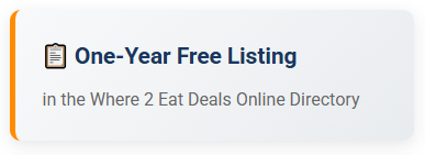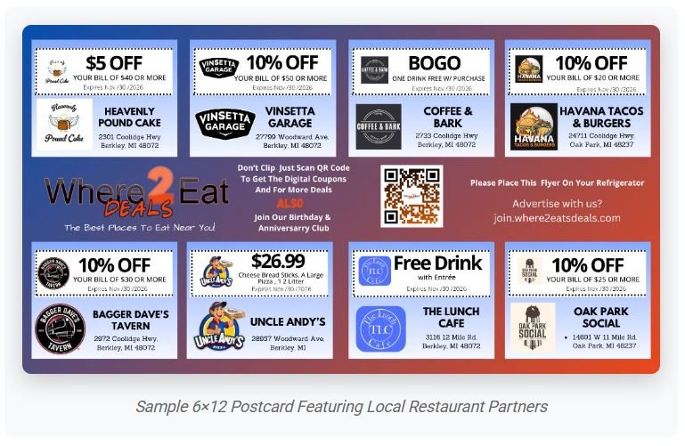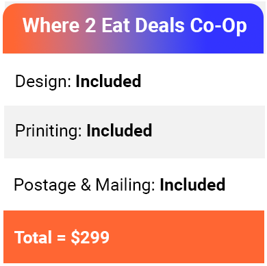 Where 2 Eat Deals puts your restaurant in front of hungry locals right when they’re deciding where to eat. Our premium 6×12 glossy postcard features exclusive coupons from 16 restaurants, mailed directly to 5,000 local homes and businesses.